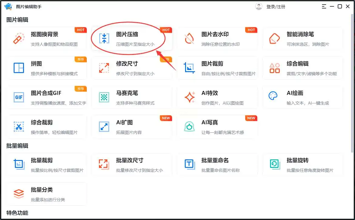 打开软件后,点击左侧菜单栏的“图片压缩”选项,进入专门的压缩界面。界面顶部有明显的功能分类,一目了然。
