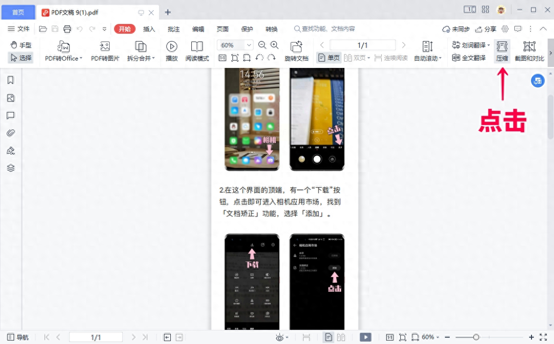 步骤二:在顶部菜单栏找到“开始”选项卡,下方工具栏中会出现“压缩”按钮,点击即可触发压缩功能。