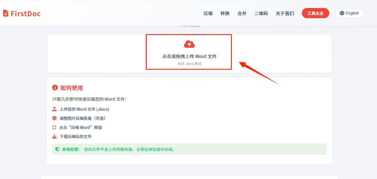 步骤一:访问FirstDoc网站,点击上传区域或拖拽Word文件到页面。注意,单文件最大支持50MB。页面下方有操作指南,新手可以参照进行。