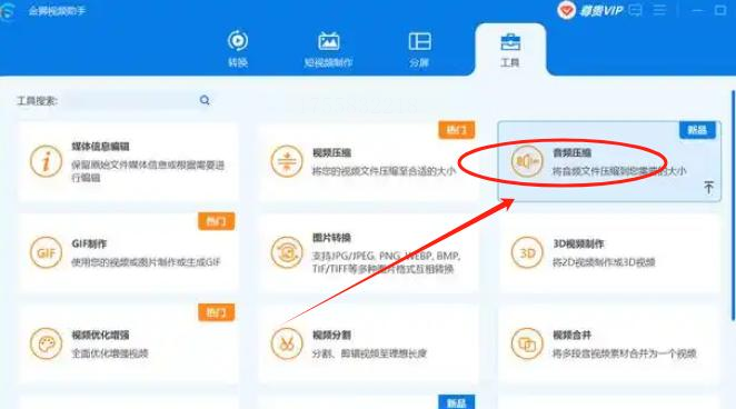 2. 找到工具模块:软件首界面会有几个模块,咱直接点“工具”模块,然后在里面找到“音频压缩”小工具,记得,不要错过哦!