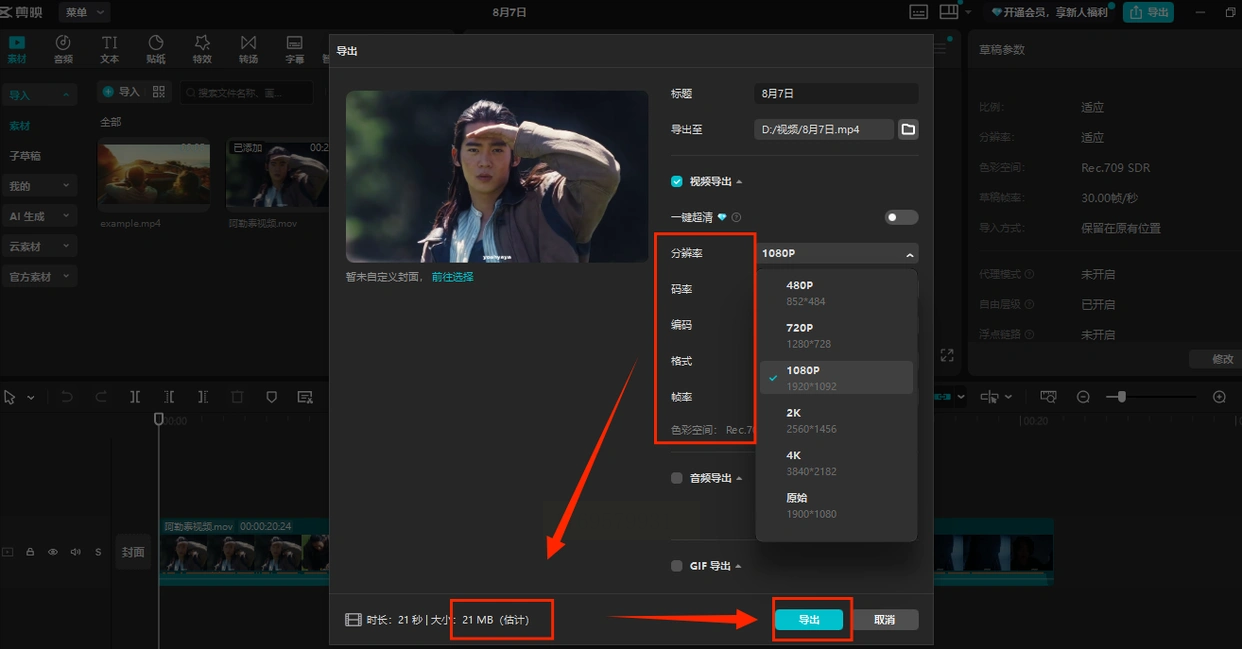 3. 导出设置:点击右上角"导出",在弹出的窗口中,可通过以下参数控制压缩效果: