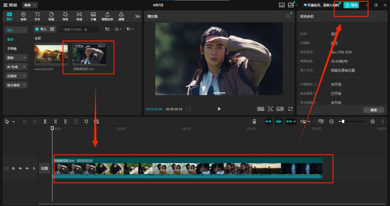 2. 时间轴编辑:将视频素材拖入下方轨道,若无需剪辑可直接跳过编辑步骤,保留原始内容。