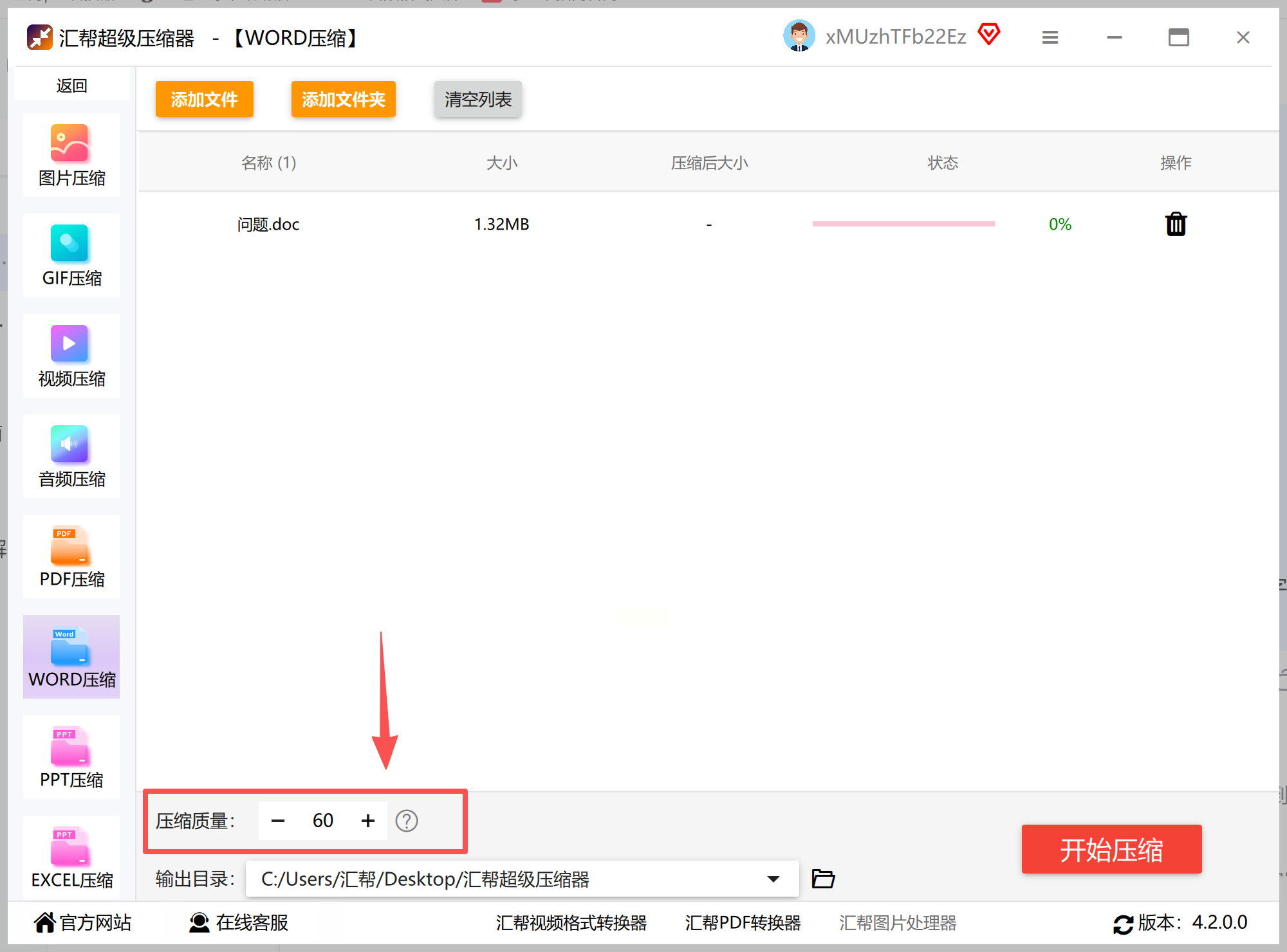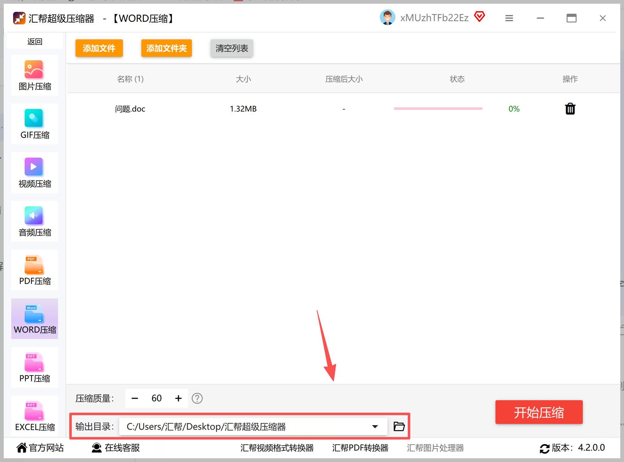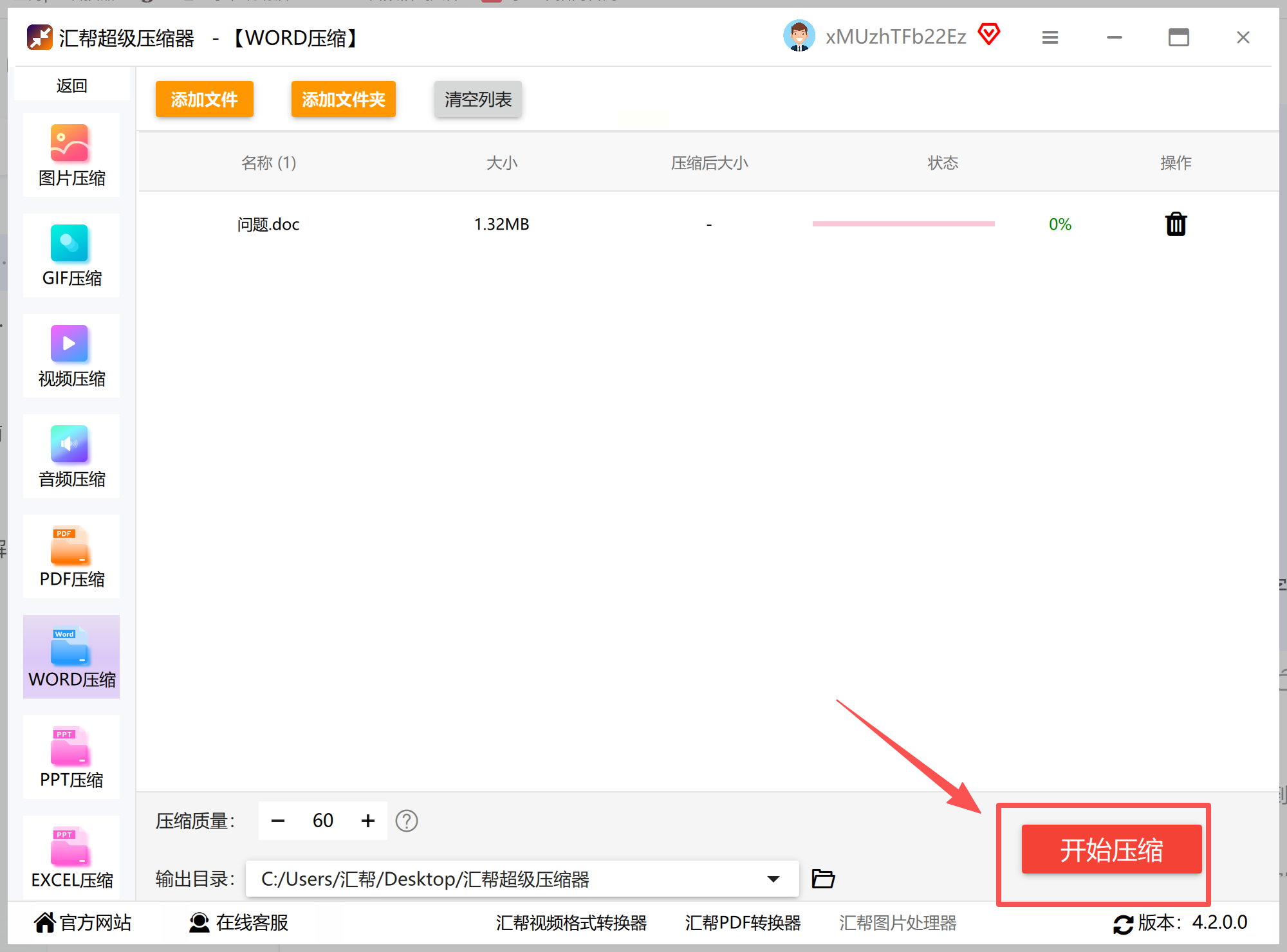 1. 打开软件:双击桌面上的“汇帮超级压缩器”图标。打开后,在分类里找“Word压缩”(就在第一个位置,图标像个小文件夹)。