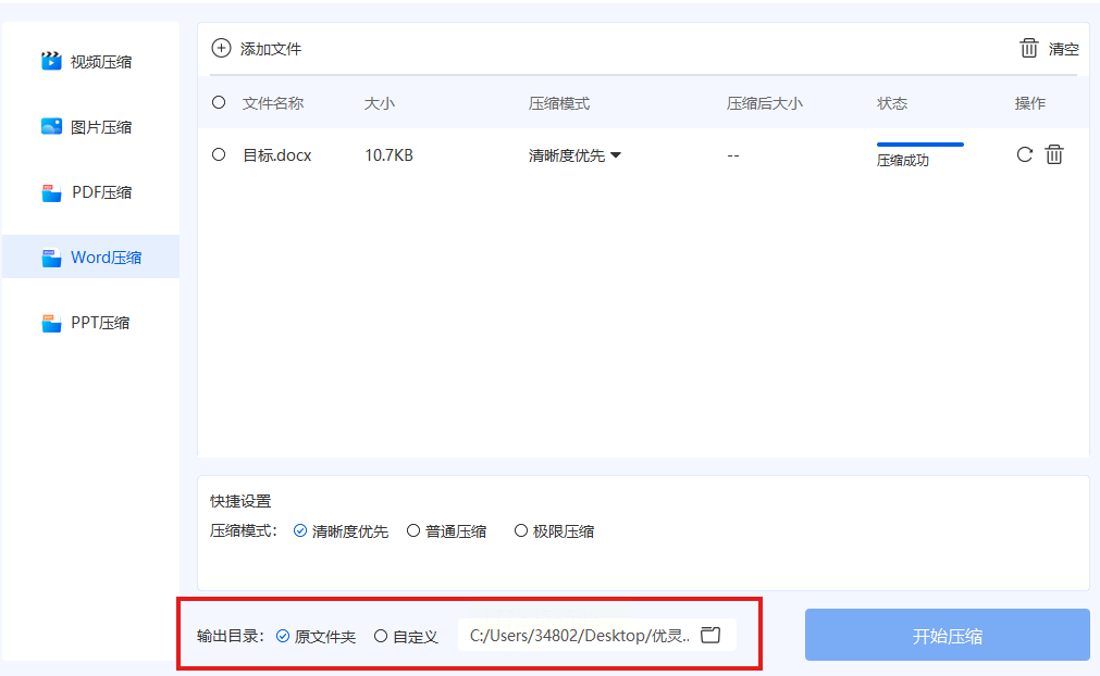 4. 选压缩模式:在“快捷设置”里,选“普通压缩”(平衡大小和清晰度)、“极限压缩”(体积最小,适合发邮件),或者“清晰度优先”(图片尽量清晰,体积稍大)。新手选“普通压缩”就好,不容易出错。