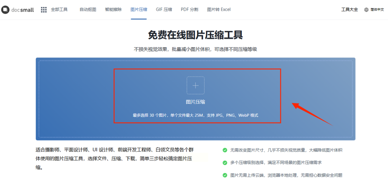 ① 进入官网点击「图片压缩」,单次上传最多30张(单张≤25MB);