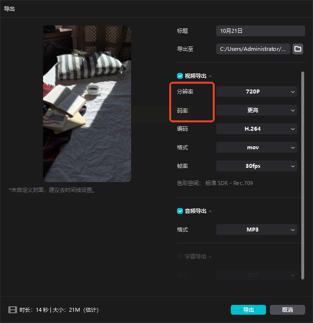 - 码率:一般选“标准”或“低码率”,剪映会自动显示压缩后的体积大小,比如原来100MB的视频,改成720P后可能变成30MB,超直观!
