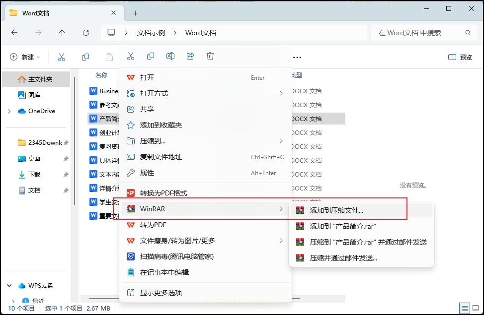 2. 在弹出的菜单里选择“WinRAR”子菜单,点击“添加到压缩文件”