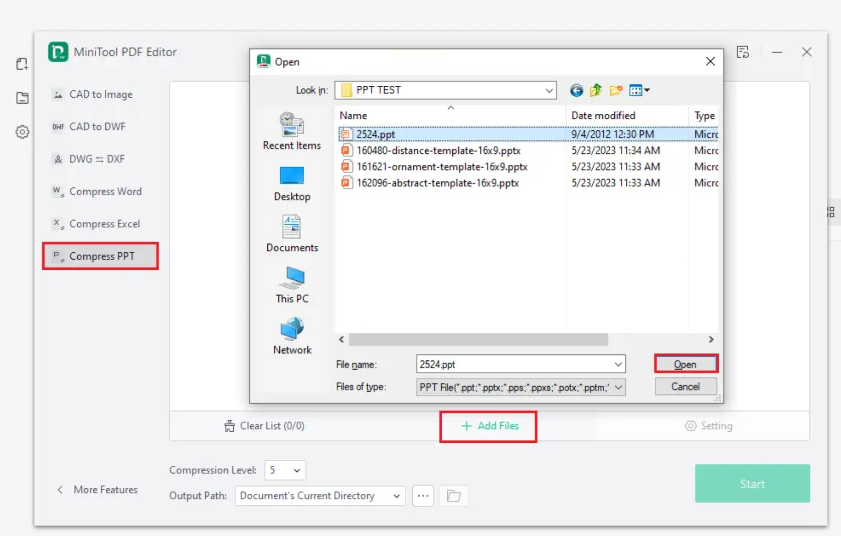 * 点击中间的 【Add Files】(添加文件)按钮,从电脑里选择你要压缩的PPT文件。