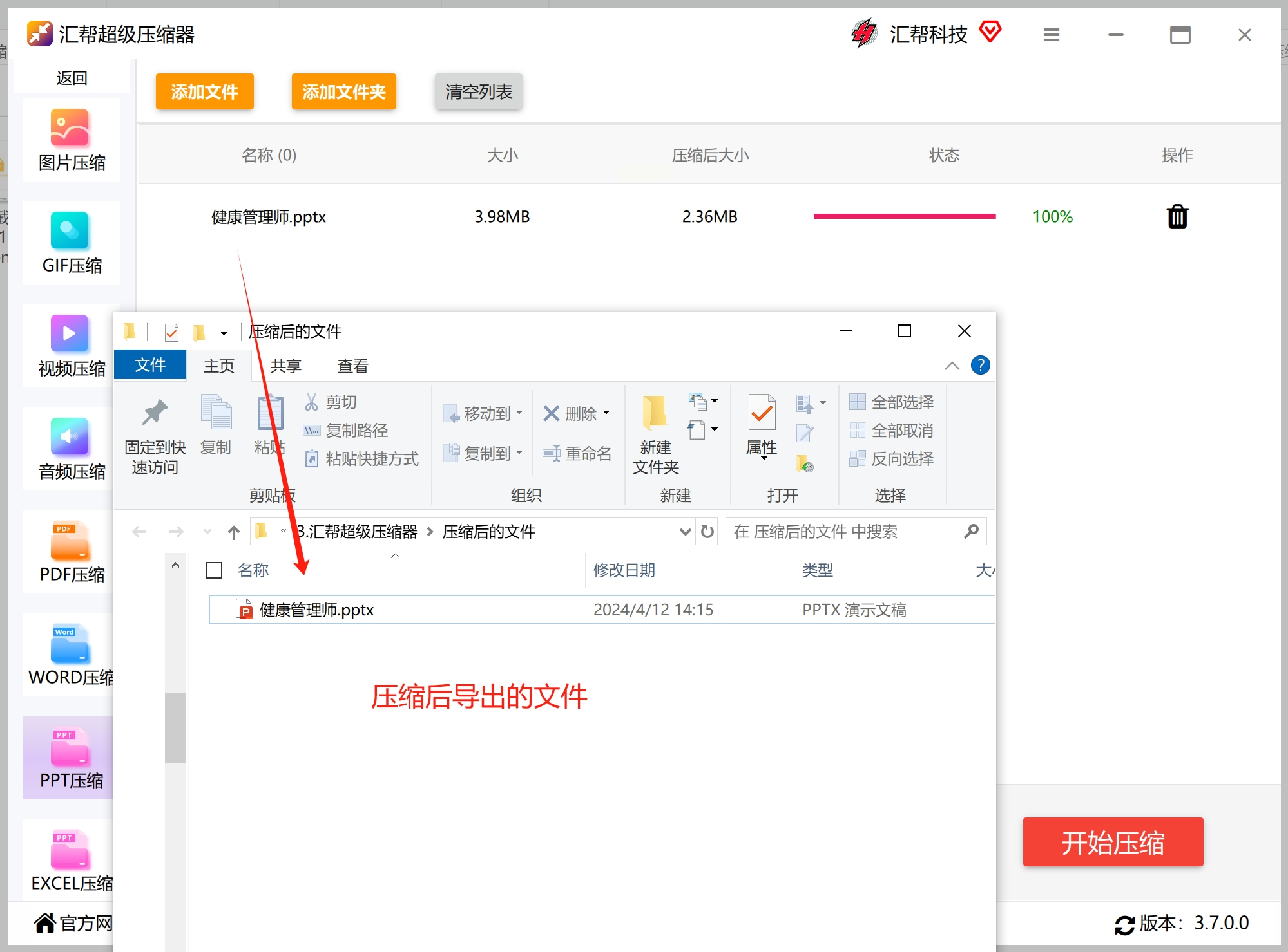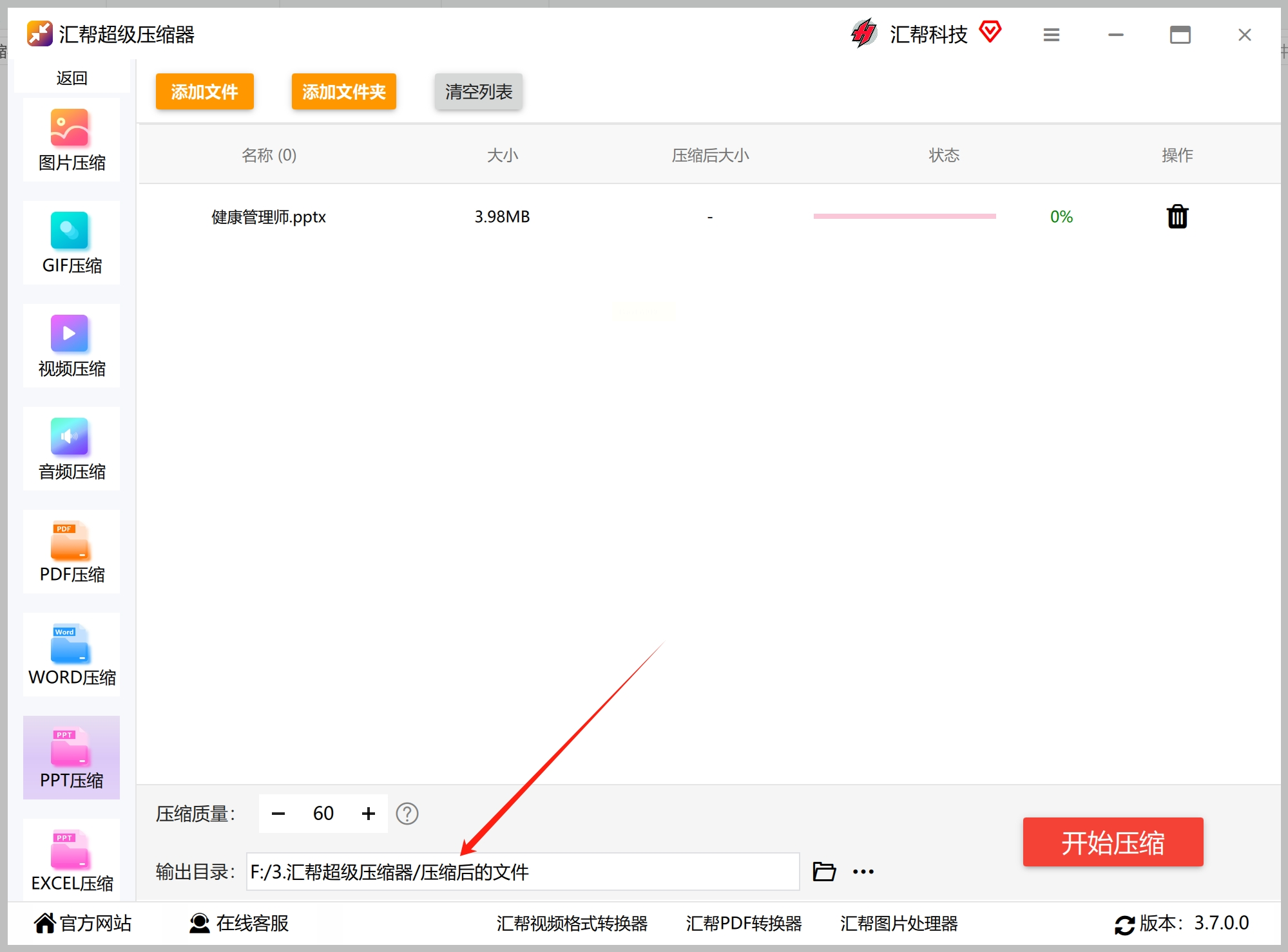 首先,在电脑上打开“汇帮超级压缩器”软件。在主界面上,你会看到针对不同文件类型的压缩选项,找到并点击 【PPT压缩】 或类似的选项,进入PPT压缩功能界面。