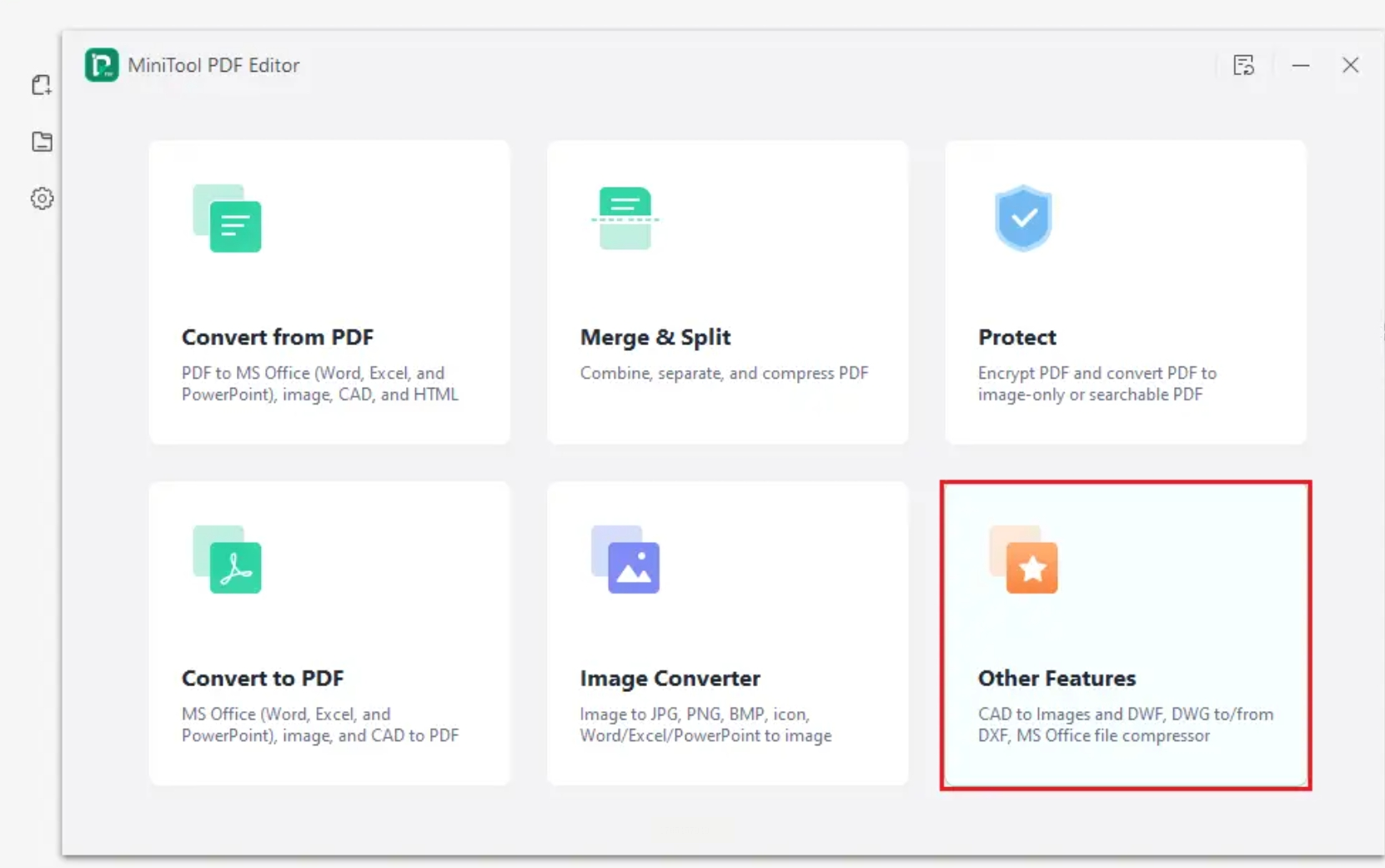 打开MiniTool软件,在主界面你可能首先看到的是PDF压缩(Compress PDF)。我们需要找到更多功能。点击窗口左下角的 【More Features】(更多功能)按钮