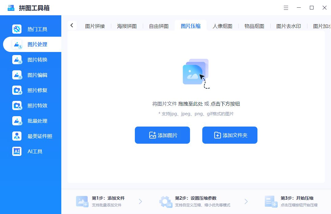 - 步骤二:通过"添加文件"或"添加文件夹"按钮批量导入图片,也可直接拖拽图片到界面