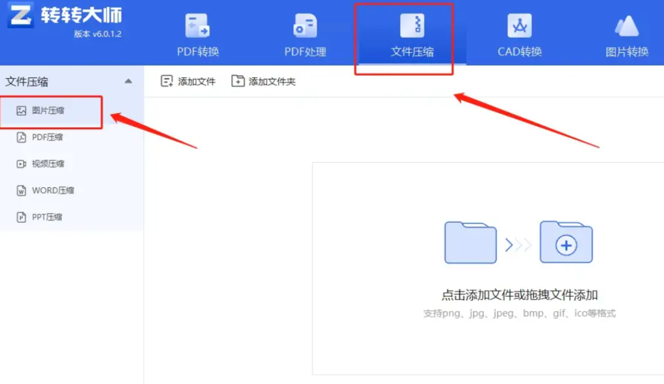 - 步骤二:通过"添加文件"按钮或直接拖拽导入需要压缩的图片