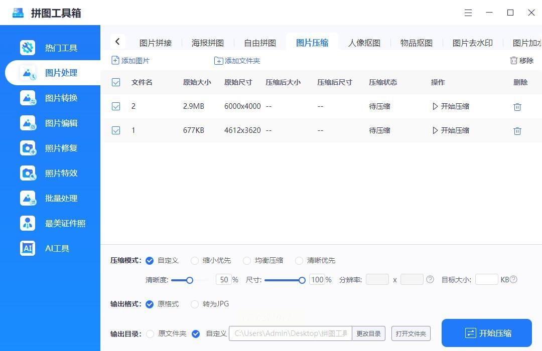 - 步骤五:点击"开始压缩",软件会自动处理所有添加的图片,完成后会有提示音