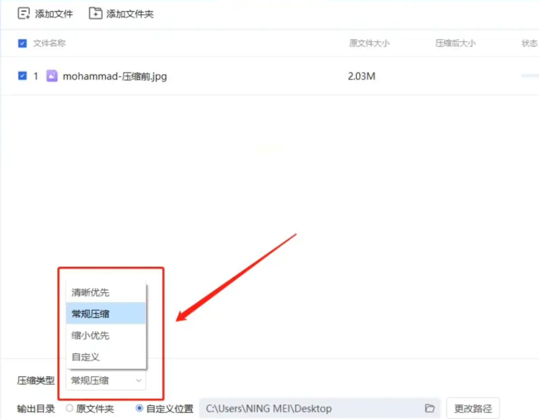 - 压缩类型:选择"质量压缩"或"尺寸压缩"