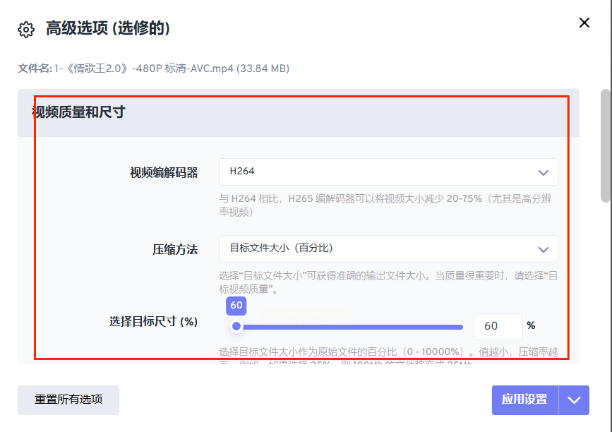在设置区域你会看到“压缩设置”或者“输出设置”这样的标签。里面通常有“视频质量”的滑动条。这个很有意思,它把复杂的参数简化成了一个直观的条。往“低”的方向拉,压缩力度就大,文件会变小;往“高”的方向拉,就会尽量保真,但文件减得少。你可以根据需求,快速拖到一个合适的位置。