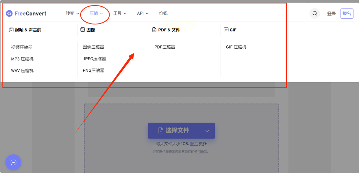 它的网站界面可能更简洁一些。一眼看去,除了视频压缩,还能处理音频和图片,功能挺全的。