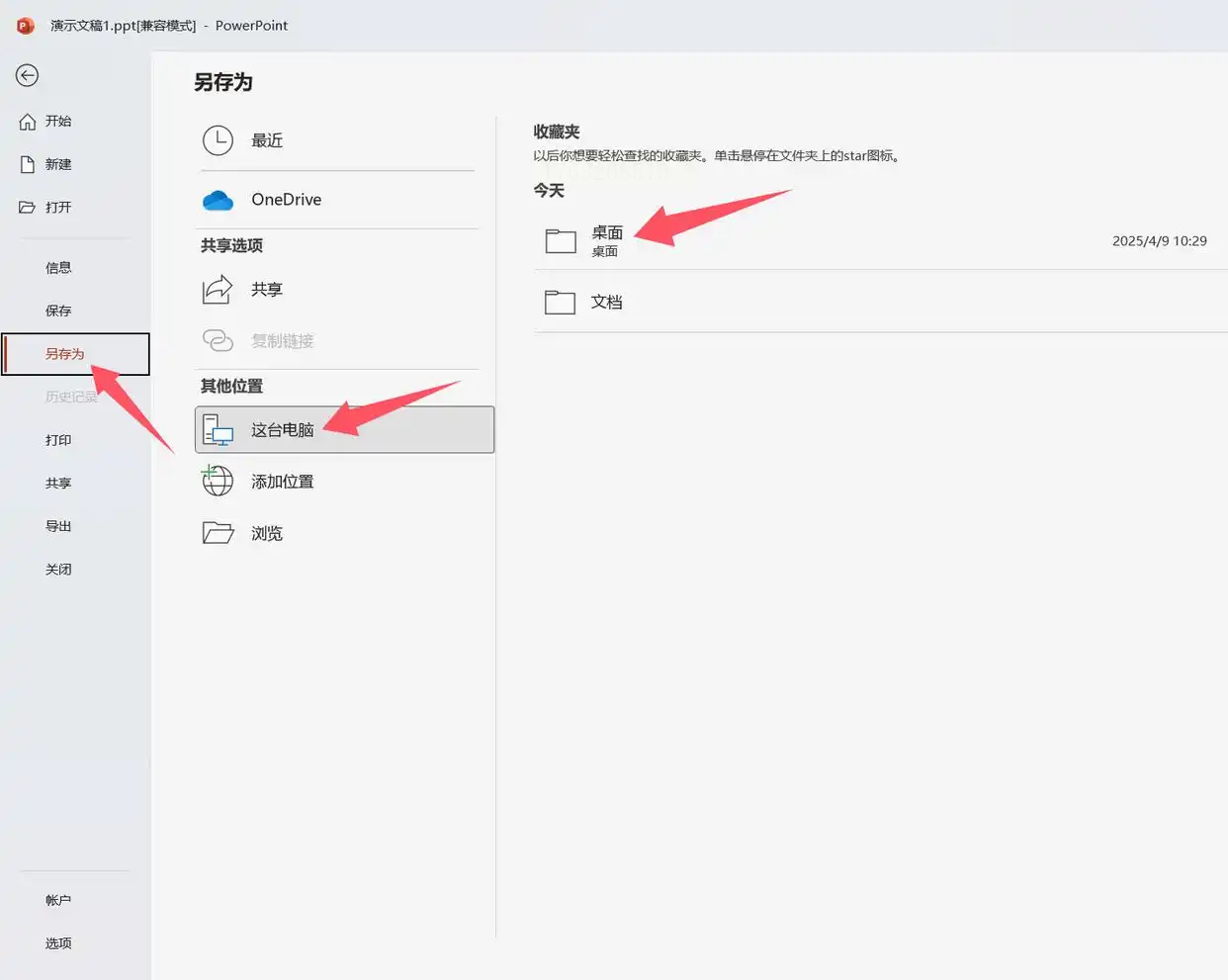 点击左上角“文件”菜单→选择“另存为”→在弹出的对话框中,点击“保存类型”下拉菜单,选择“PowerPoint演示文稿(*.pptx)”或“PowerPoint 97-2003演示文稿(*.ppt)”(后者体积可能更大,建议优先选择前者)。
