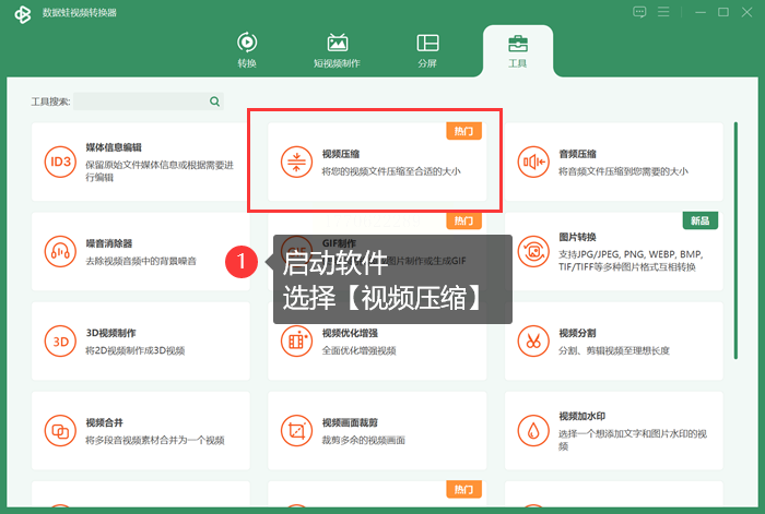 在计算机上安装并启动数据蛙视频转换器。在主界面中,通常可以找到“工具箱”或“更多功能”等标签,从中精准定位并点击“视频压缩”功能模块。