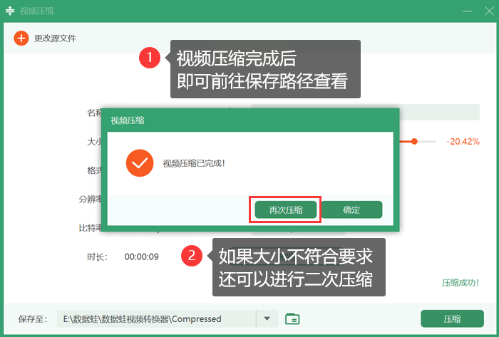 确认所有设置无误后,点击“开始压缩”或“压缩”按钮。进度条会显示处理状态。完成后,软件通常会提供“打开输出文件夹”的快捷方式,方便您立即查看压缩效果。如果对文件大小仍不满意,可以利用“再次压缩”功能进行微调。