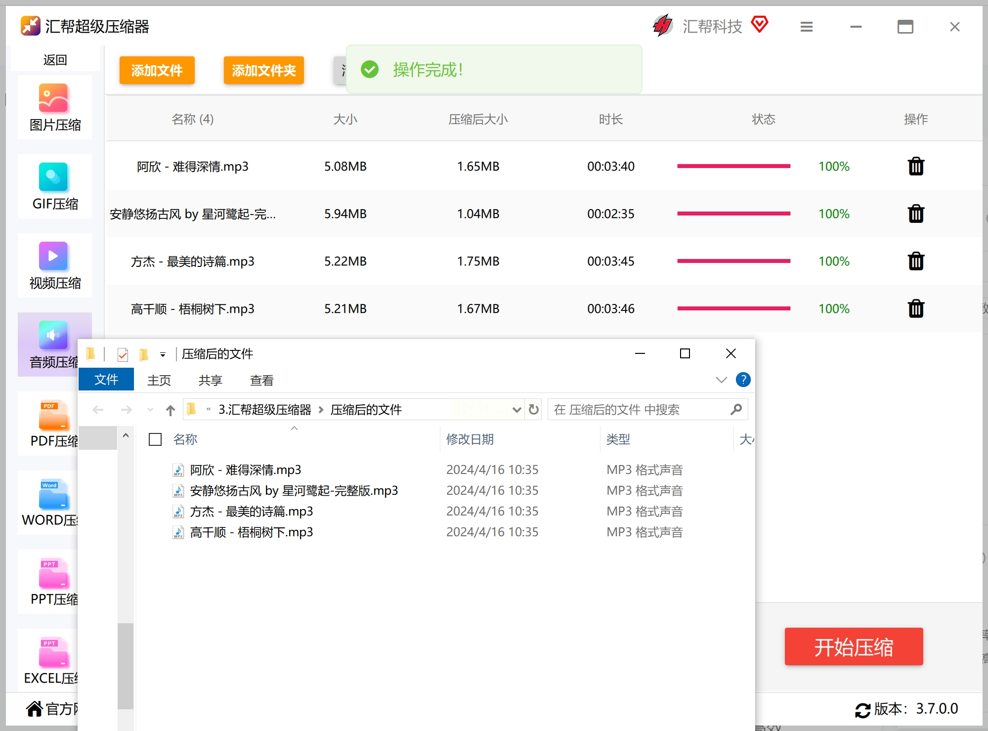 6. 压缩完成后,软件会给出“操作完成”之类的提示。这时,你就可以去之前设置好的输出文件夹里查看压缩后的MP3文件了。
