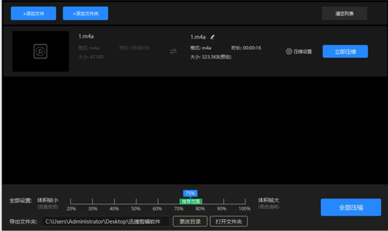 3. 添加好需要处理的音频后,直接点击【全部压缩】按钮。软件通常会按照默认的或之前设置好的参数进行压缩。你可以在设置里预先调整好压缩强度。