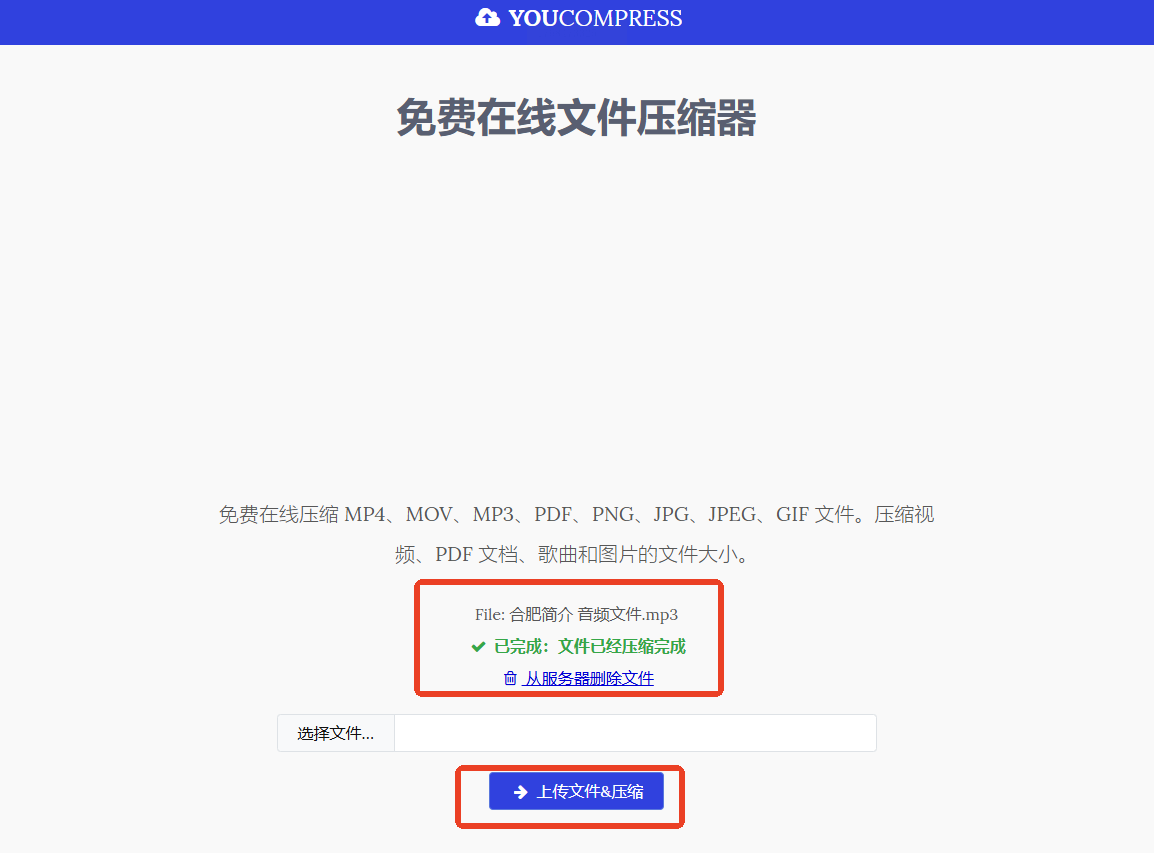 文件上传成功后,确认格式与文件名,点击“上传文件并压缩”之类的按钮。服务器将自动处理。