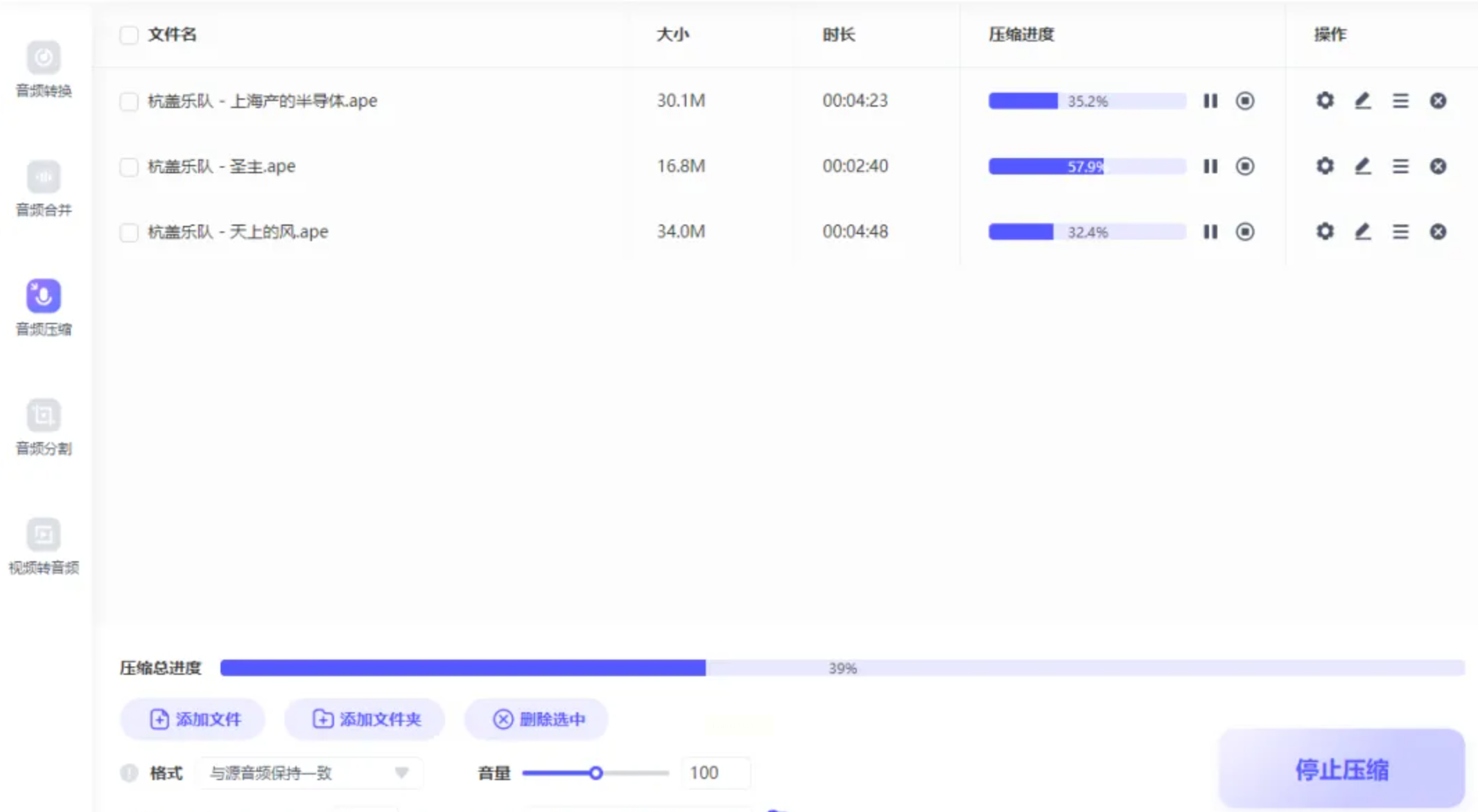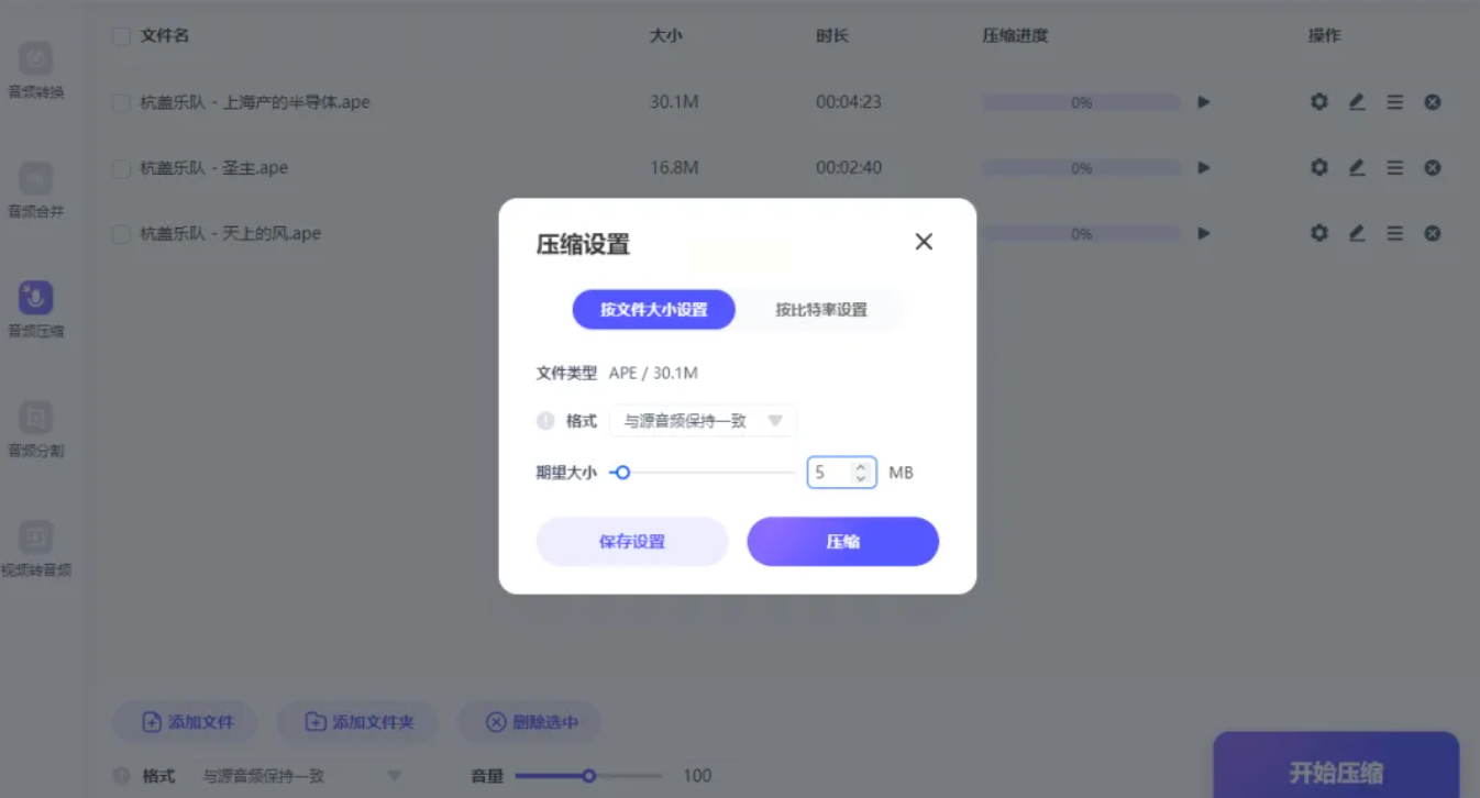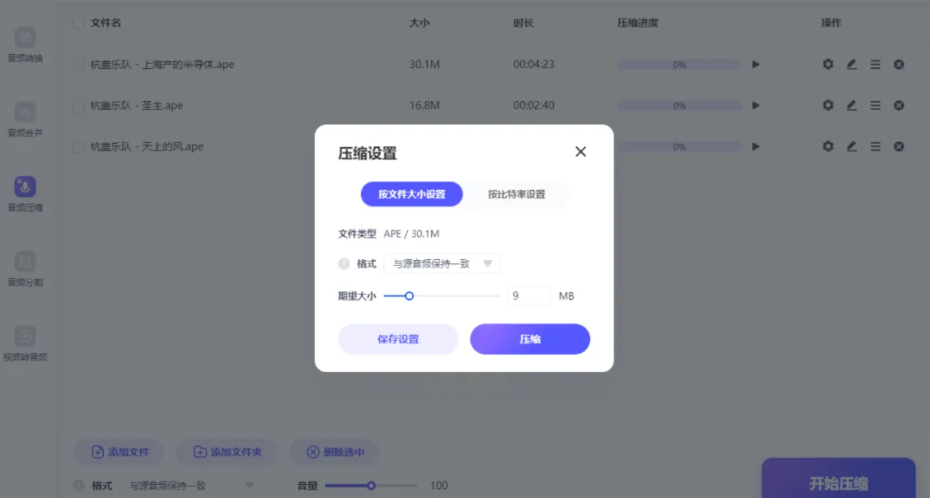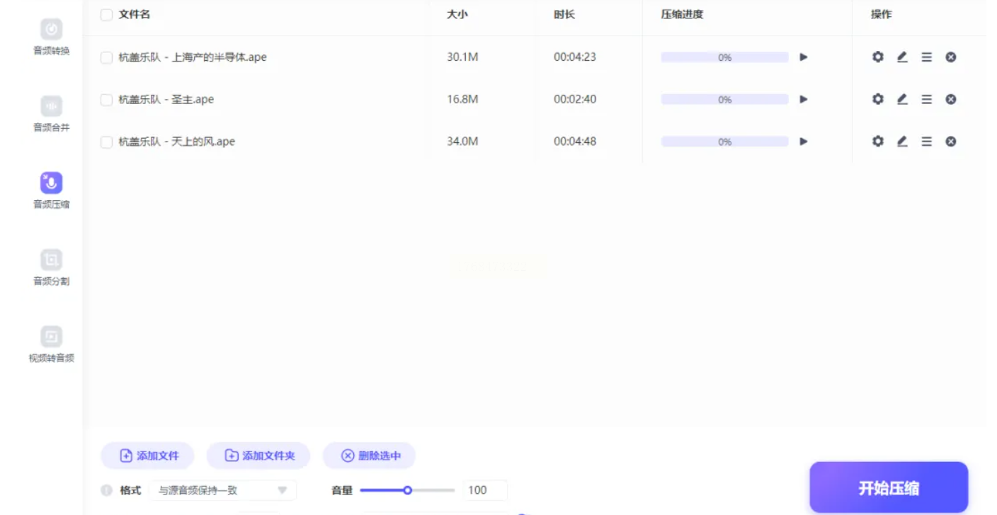 通过界面内的“添加文件”按钮,导入您想要压缩的音频。该软件支持批量操作,可一次性添加多个文件。