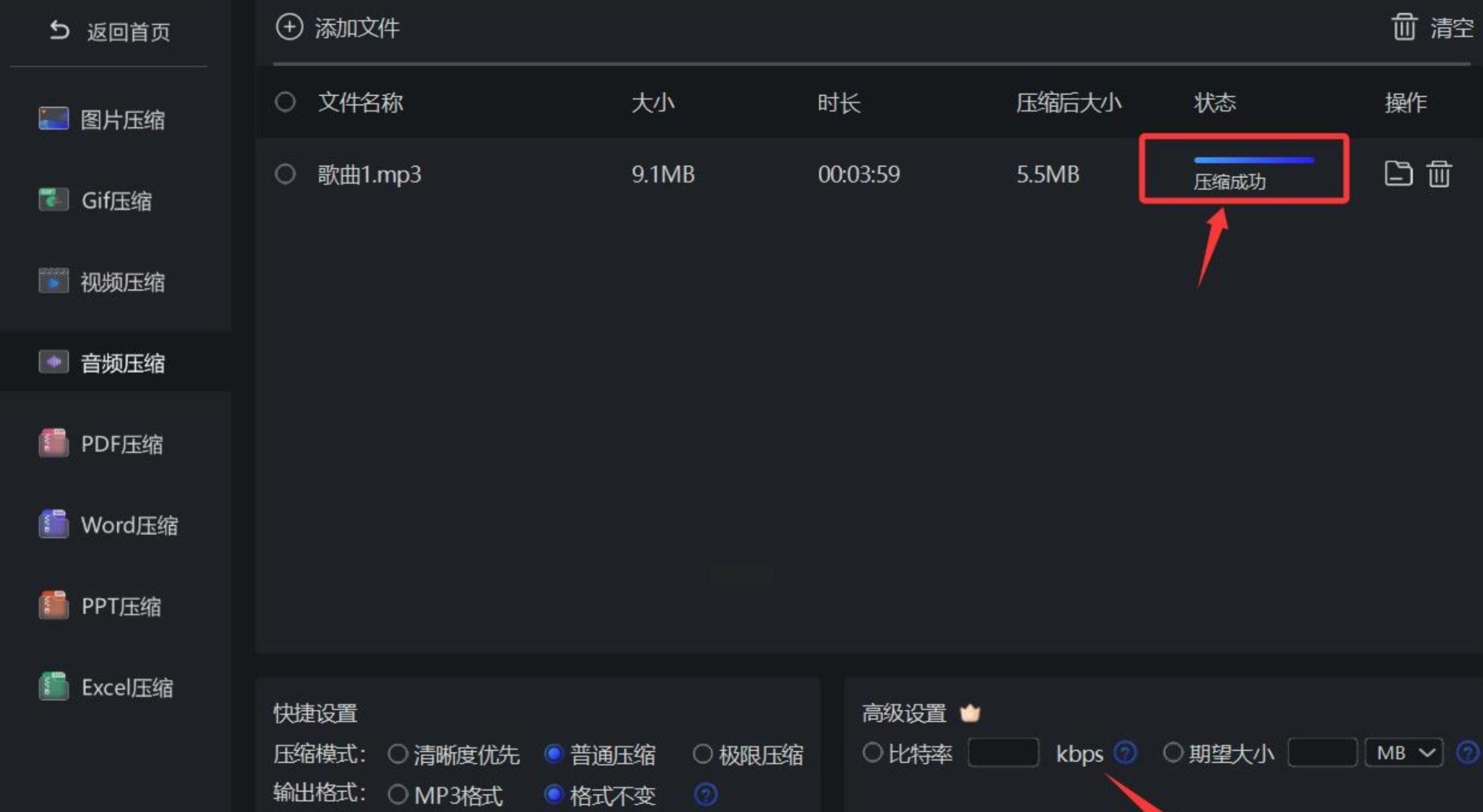 打开软件,在侧边栏工具集中找到“音频压缩”。点击“添加文件”或使用拖拽方式导入音频。