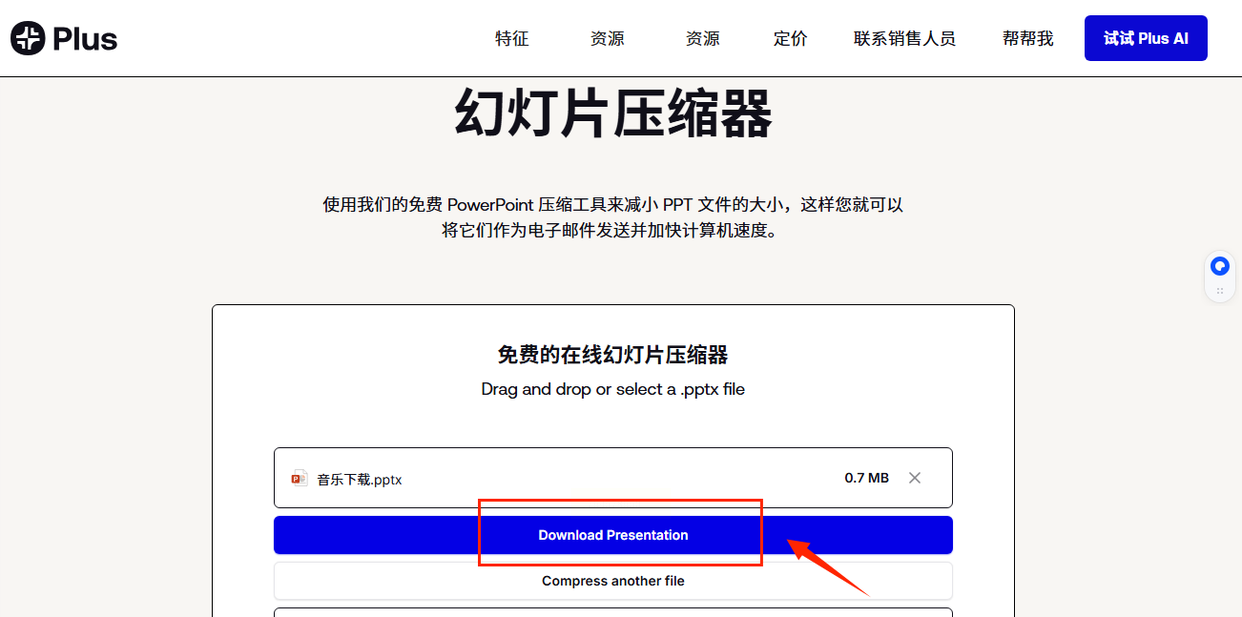 选“PPT压缩”模式,点“开始压缩”,进度条走完后直接下载。压缩后建议打开检查: