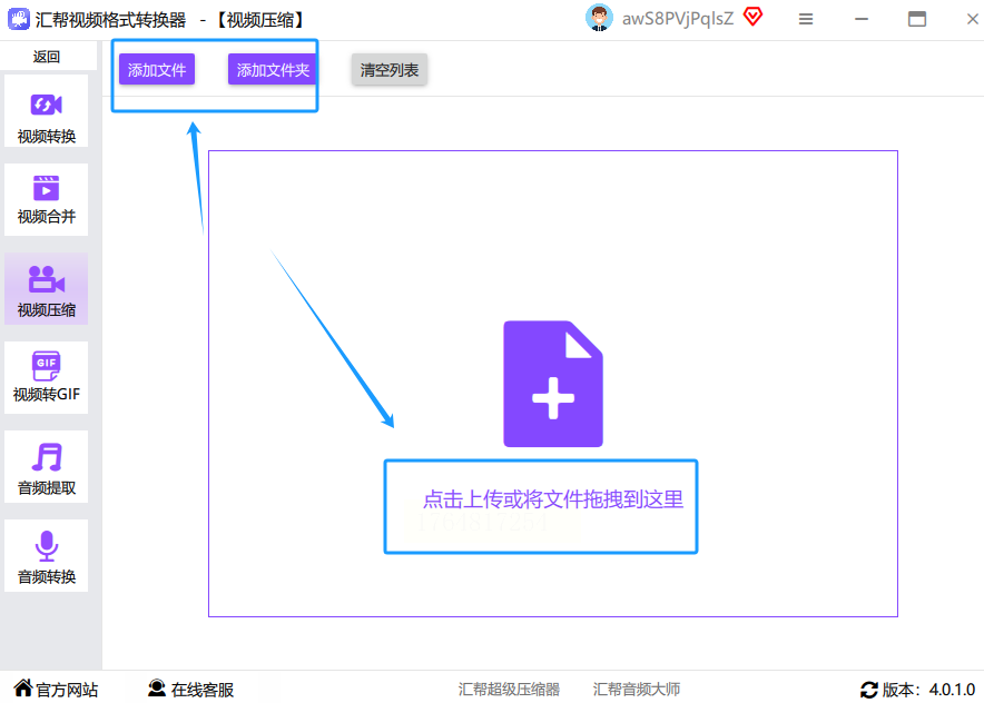 2. 点击上传你的视频文件。它支持MP4、AVI、MOV这些常见格式,基本上都能吃进去。