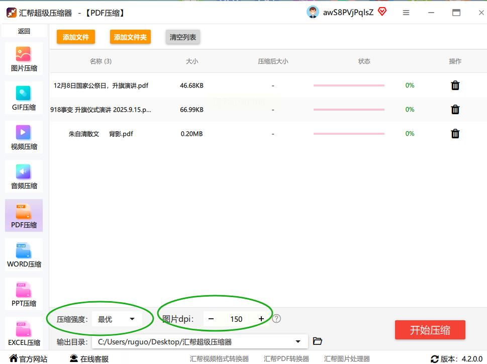 - 图片PDF:DPI从300→150,压缩强度“最优”