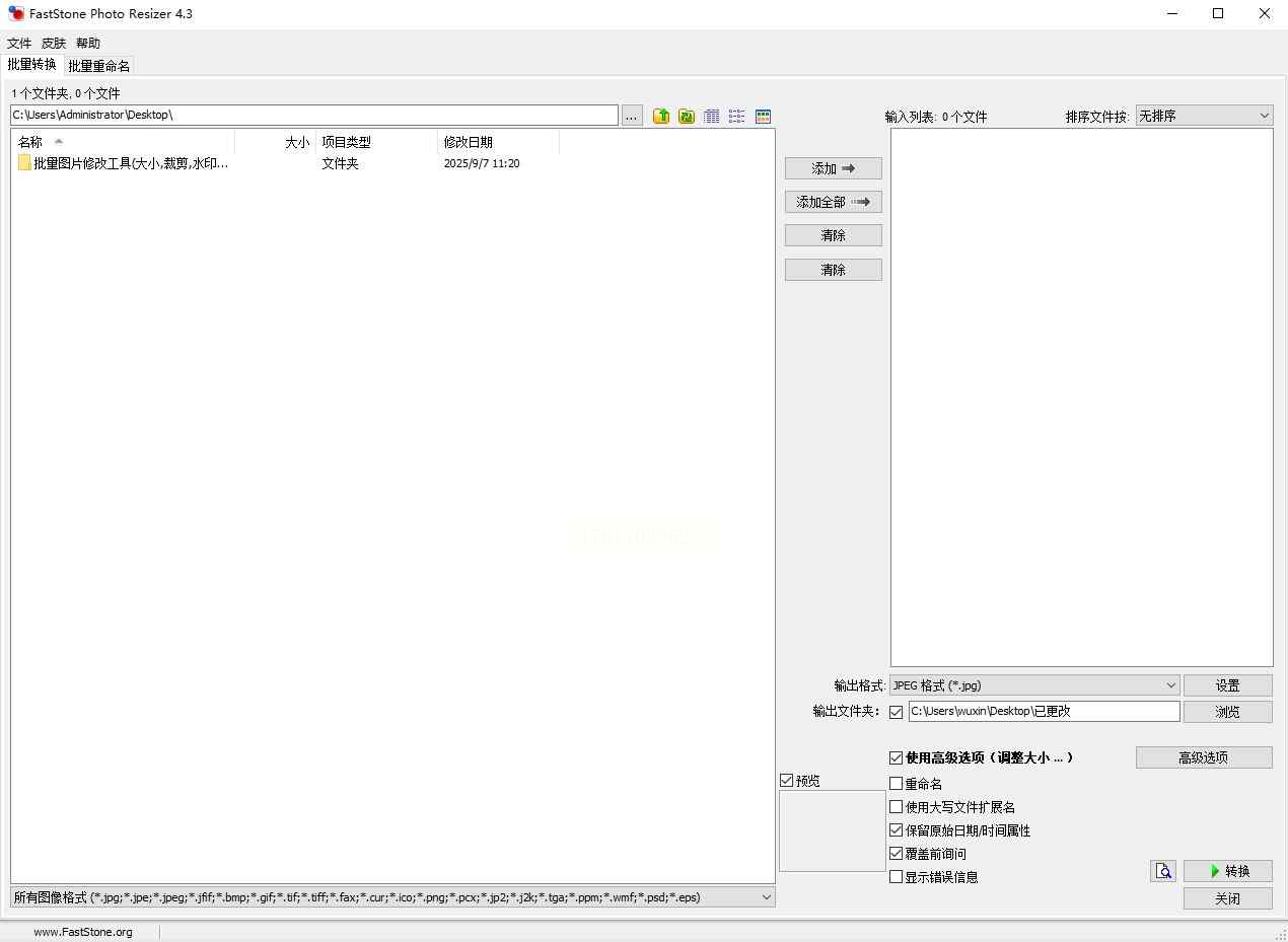 1. 安装后选择“批量转换/重命名”模式,通过“添加文件”或“浏览文件夹”导入图片