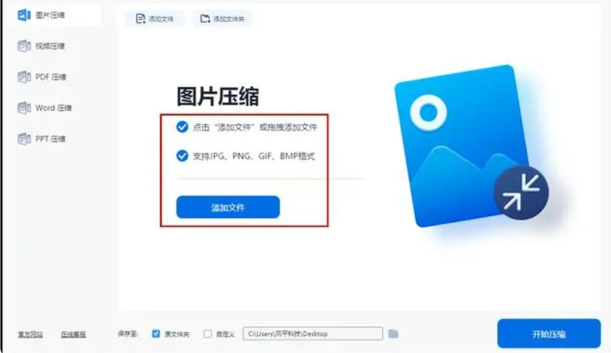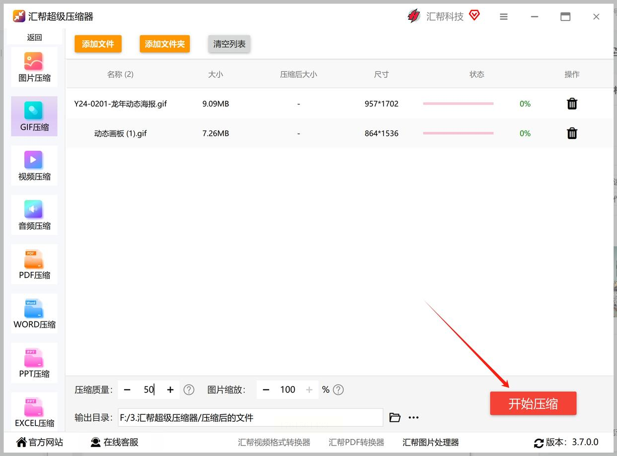 5. 点击开始压缩按钮,观察进度条至100%完成处理