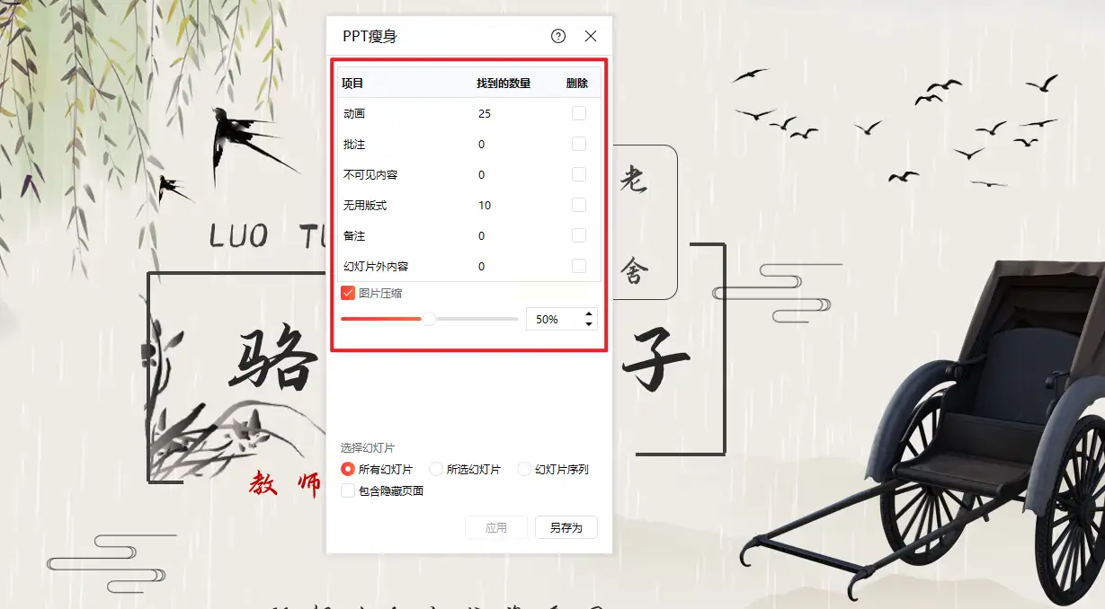 2. 勾选关键优化项:我通常只选「压缩图片」和「删除隐藏内容」(这一步能省掉约30%的文件体积!),如果PPT有动画效果记得先点「动画清理」,不然压缩后动画会卡顿