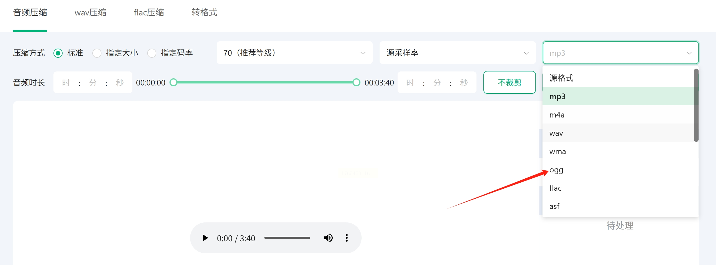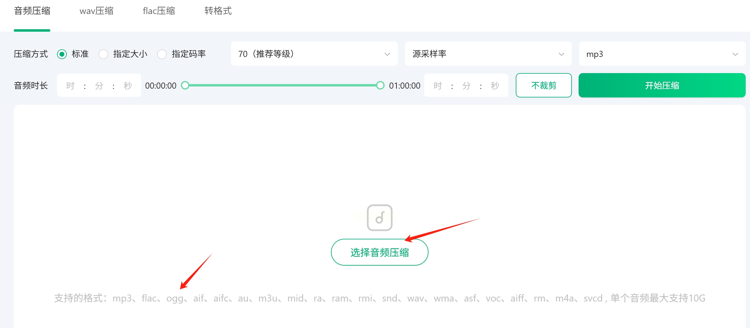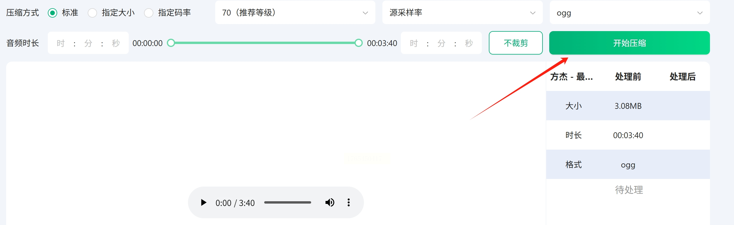 2. 上传文件:点击页面中央的 “选择音频压缩” 或类似按钮,从你的电脑中选择需要处理的OGG文件并上传。