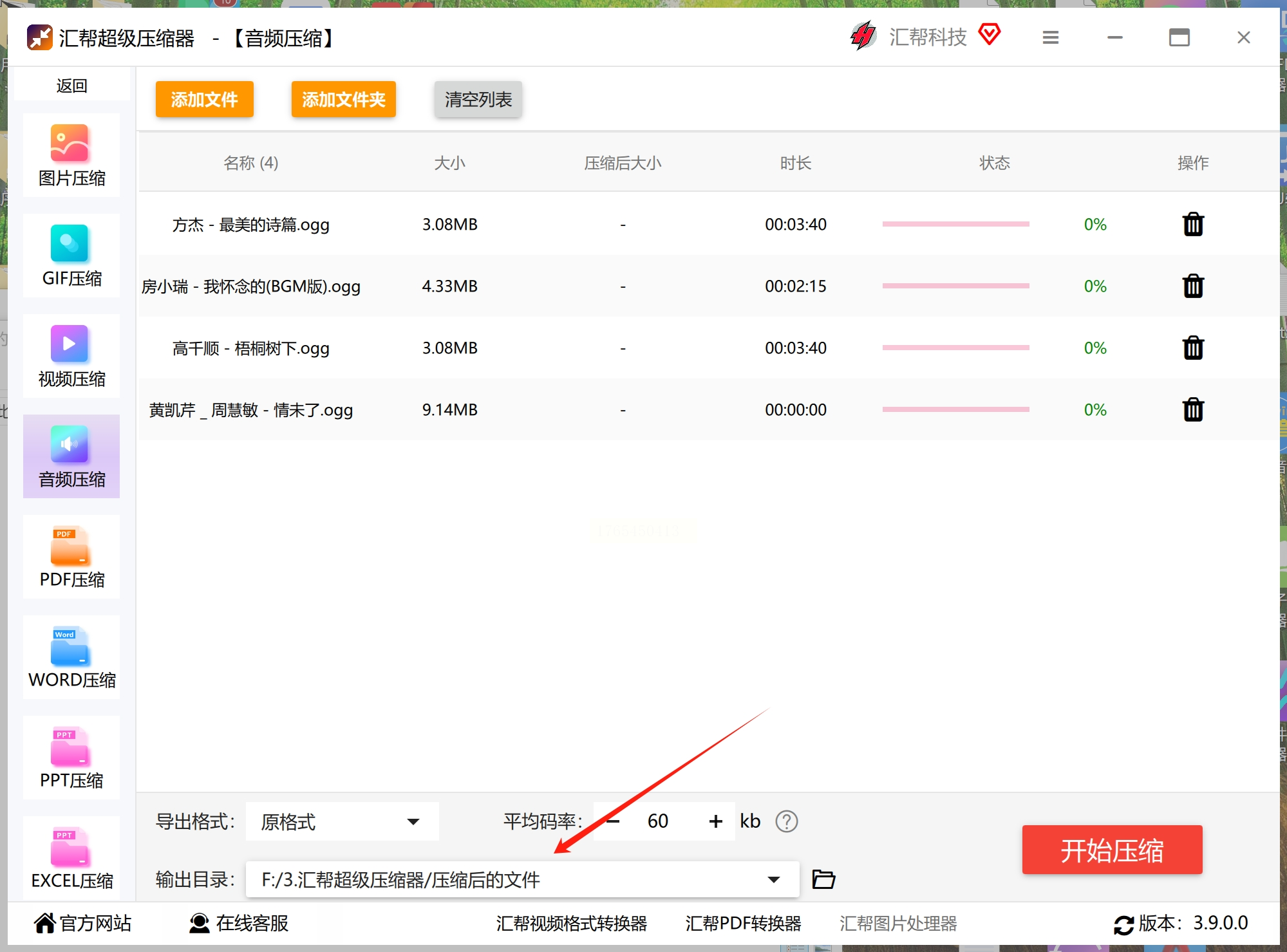 3. 选择格式:上传后,页面上通常会有输出格式选项。为了保持OGG格式,我们选择 “OGG”。然后在下面设置一个输出文件夹用来存储压缩后的音频文件。