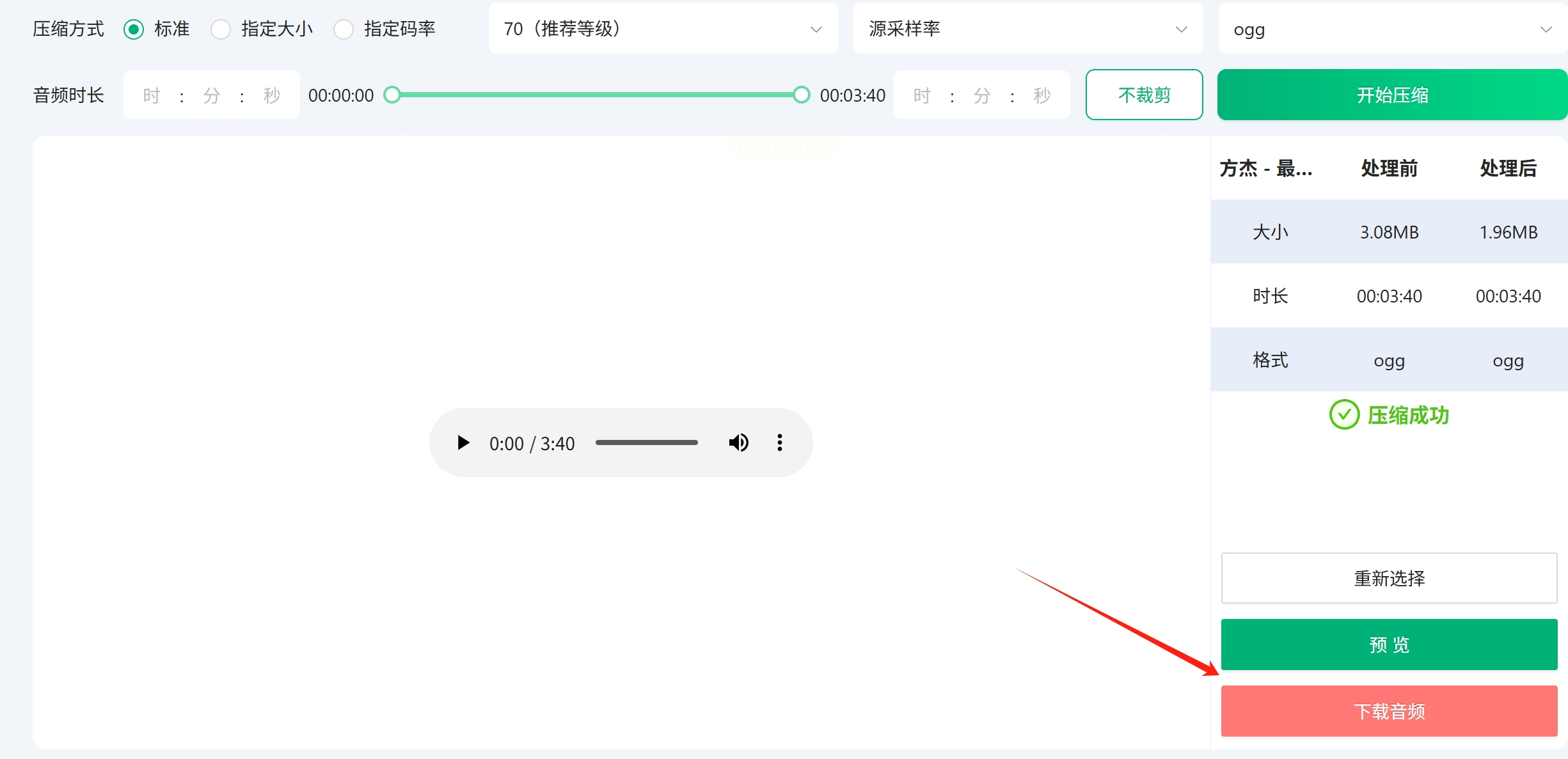 5. 下载文件:处理完成后,页面会刷新或弹出提示,显示“压缩完成”。点击 “下载音频” 按钮,就可以把压缩后的OGG文件保存到你的电脑本地了。