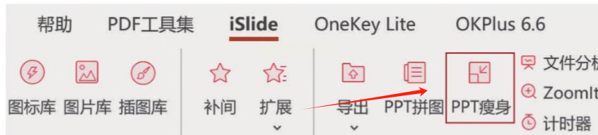 点击顶部菜单栏的“iSlide”选项,在下拉菜单中选择“工具”→“PPT瘦身”。