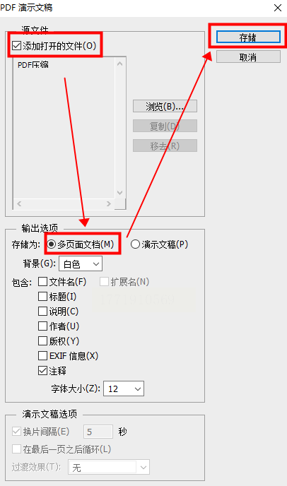 步骤四:在弹出的窗口里,确保勾选了“添加打开的文件”。输出选项选择“多页面文档”,然后点击“存储”。