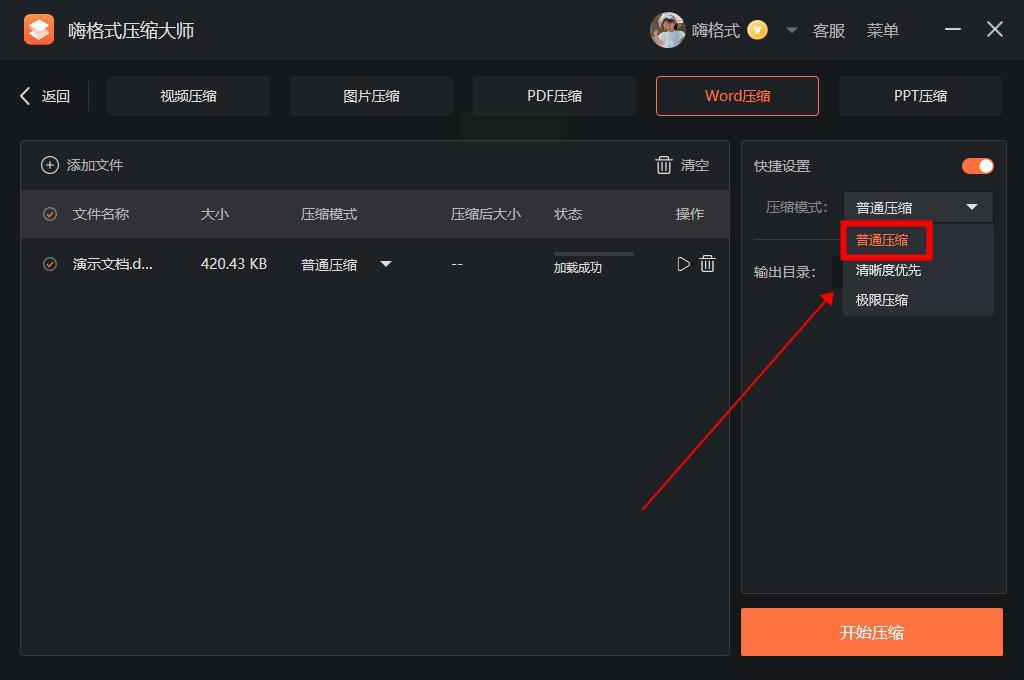 步骤二:添加要压缩的Word文档,在右侧设置压缩等级,比如普通压缩或清晰度优先。