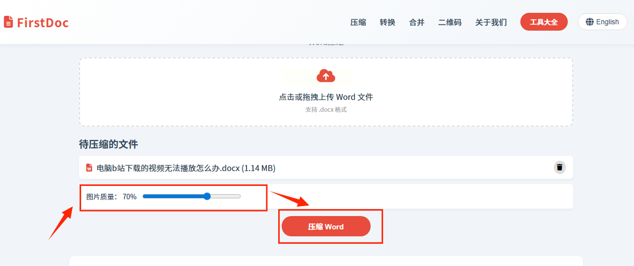 FirstDoc的在线工具适合快速压缩Word,尤其擅长处理内嵌图片。
