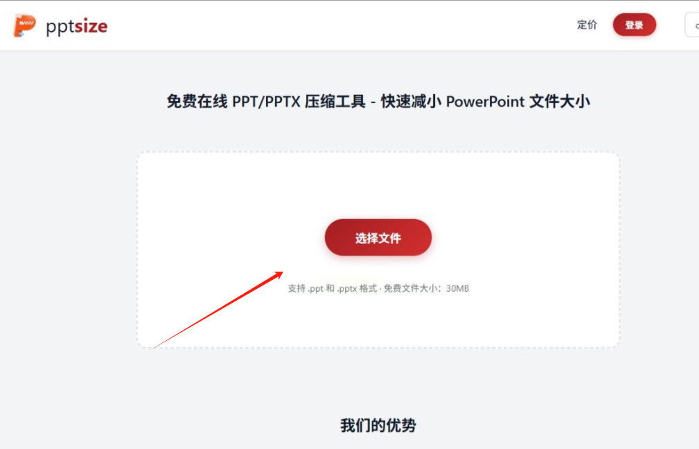 2. 在网页中央,你会看到一个清晰的“+”号按钮或上传区域。点击它,然后从电脑中选择你需要压缩的PPT文件。
