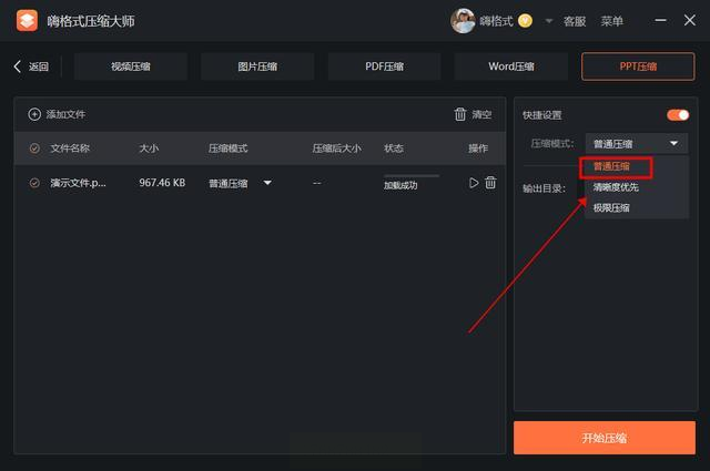 接着,在简单的模式选择(如“常规”、“深度”)中挑一个,点击“开始压缩”即可。它省去了许多复杂设置,追求的是快速解决问题。