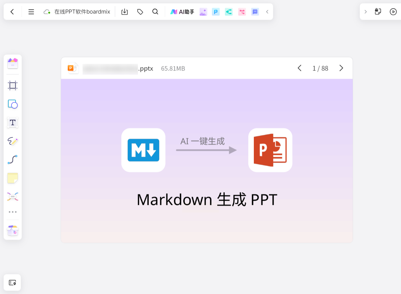 3. 上传后,整个PPT会以可编辑对象的形式平铺在无限画布上。你可以点击右上角的视图切换按钮,以缩略图形式浏览所有页面。