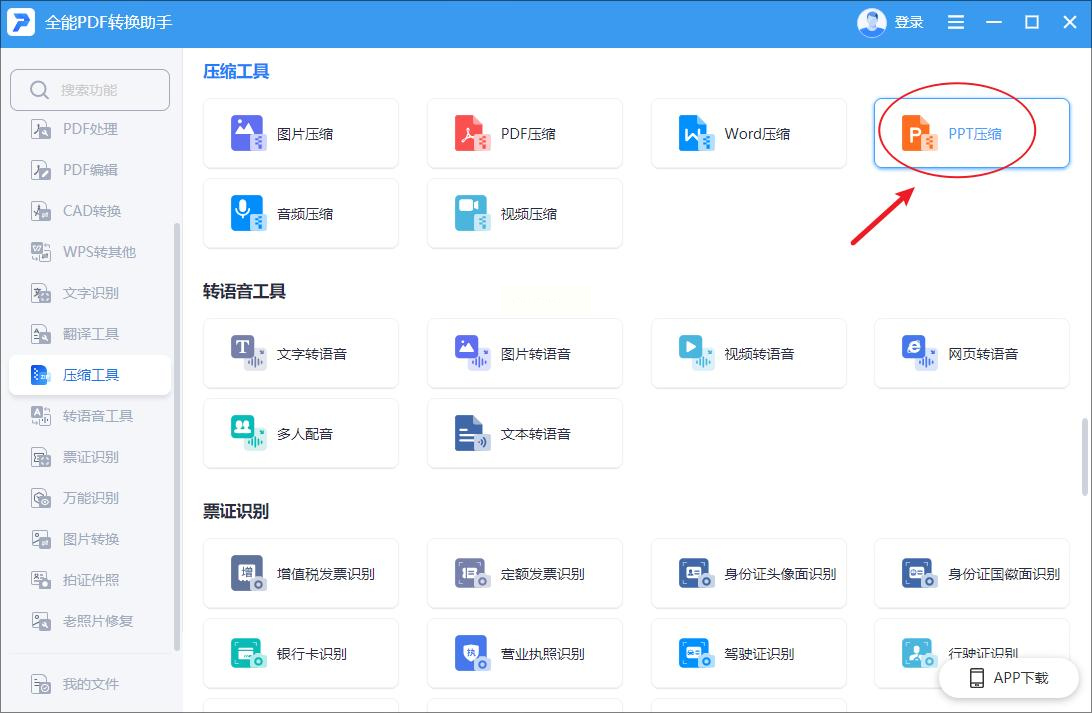 打开软件后,在主界面中找到并点击“PPT压缩”选项。这个功能模块会专门处理PPT文件的压缩需求,界面简洁直观,即使是新手也能快速上手。