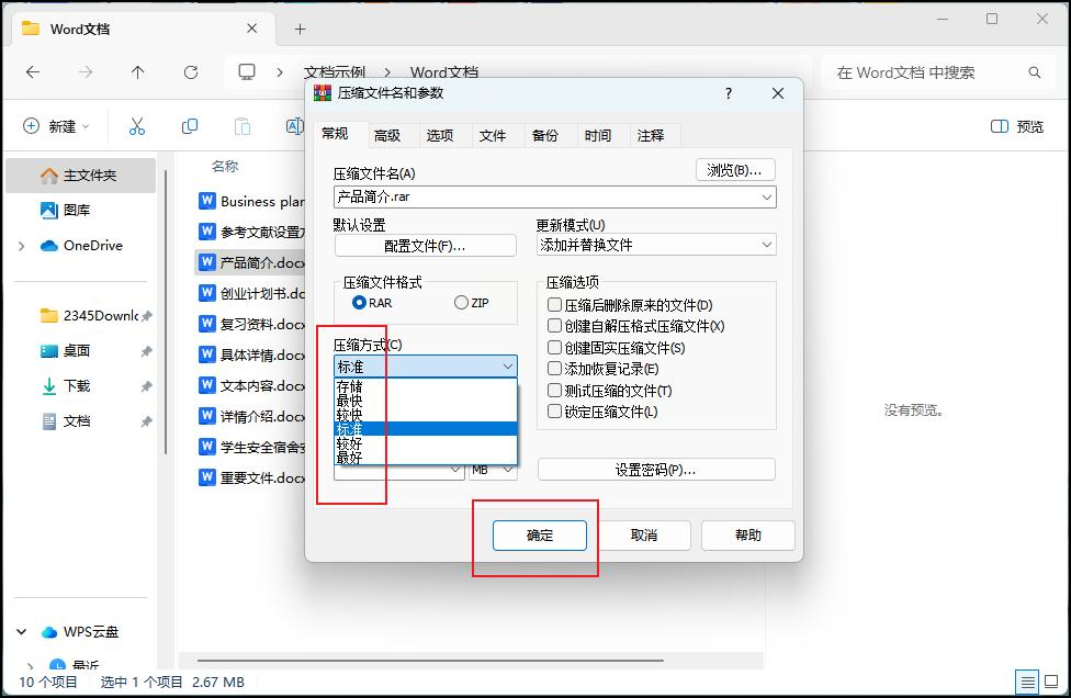 3. 这时会弹出一个设置窗口。你可以在这里选择压缩格式(比如ZIP或RAR),设置压缩级别(例如“标准”或“最好”),如果文档需要保密,还可以设置密码。