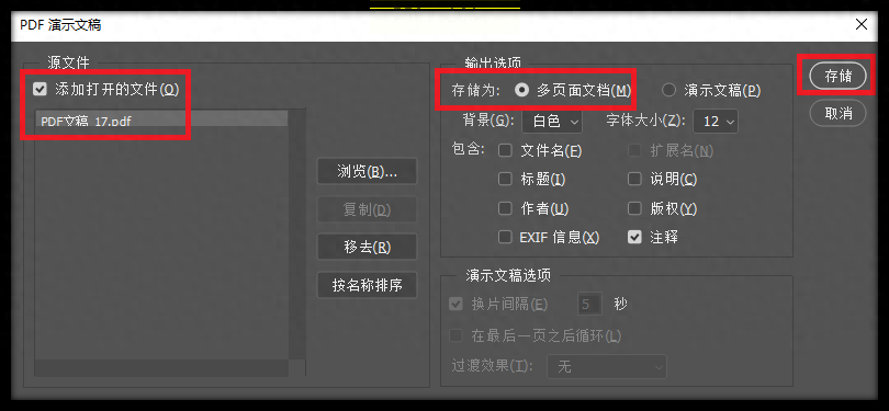 步骤二:在弹出窗口中,勾选“添加最近打开的文件”,下方会显示已导入的PDF名称。选择存储为“多页面文档”,点击“存储”按钮。