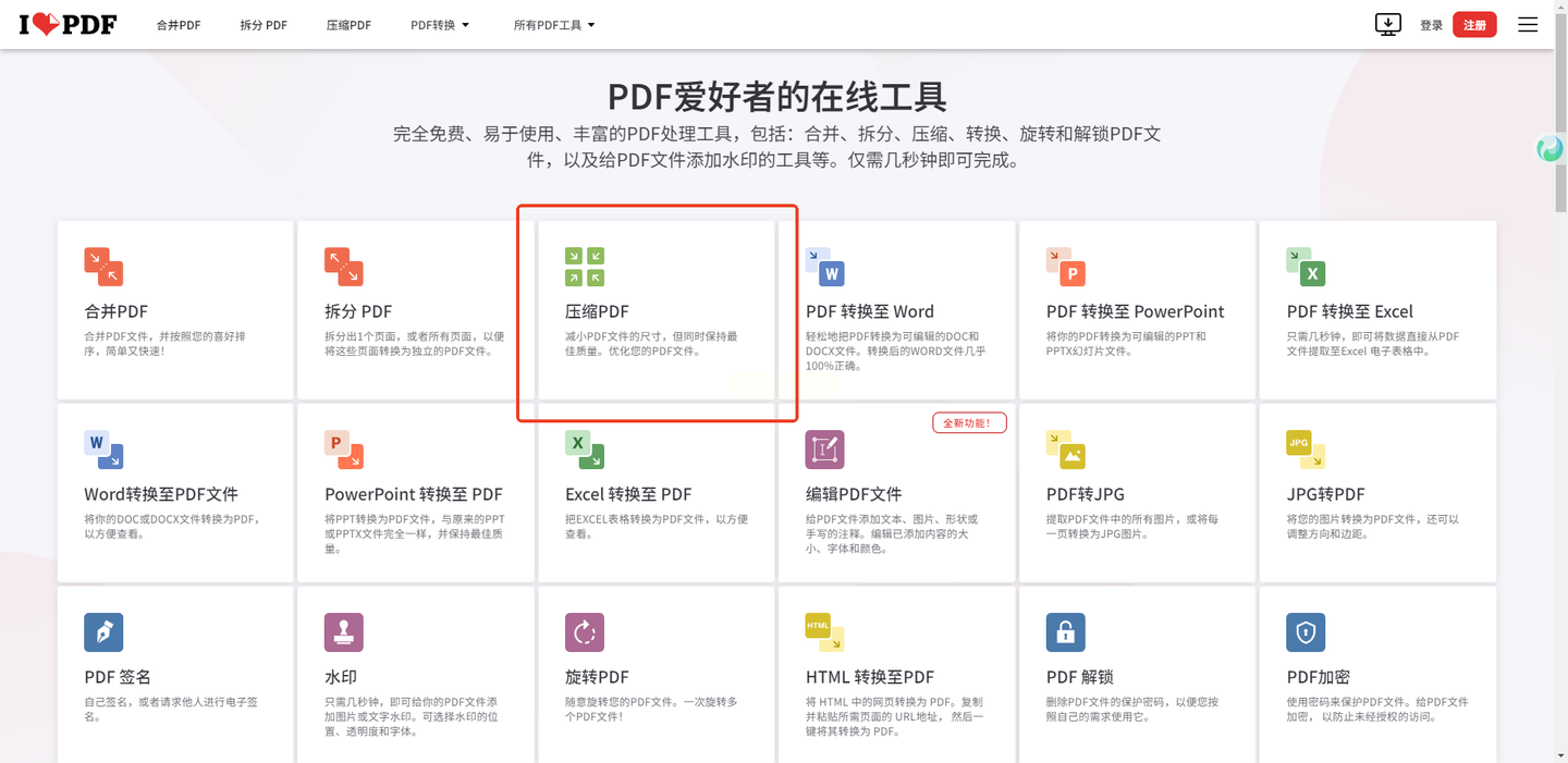 步骤一:访问ilovepdf网站,在首页找到“压缩PDF”功能。