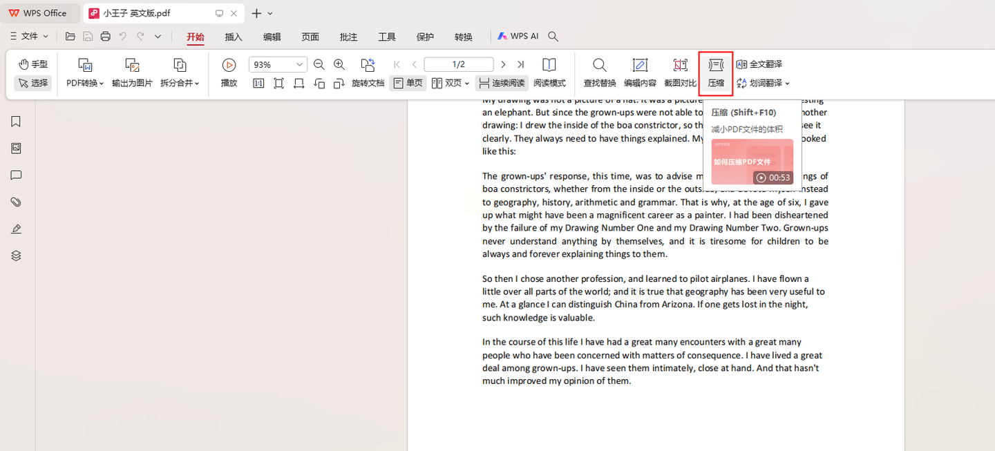 步骤一:在WPS中打开需要压缩的PDF文档,点击顶部菜单栏的“开始”选项卡。