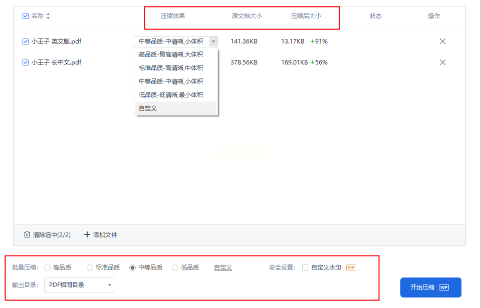 步骤三:在弹出窗口中,可继续添加其他PDF文件进行批量处理。软件提供四种压缩品质选项,也支持自定义设置,并实时显示压缩后的大小和压缩率。